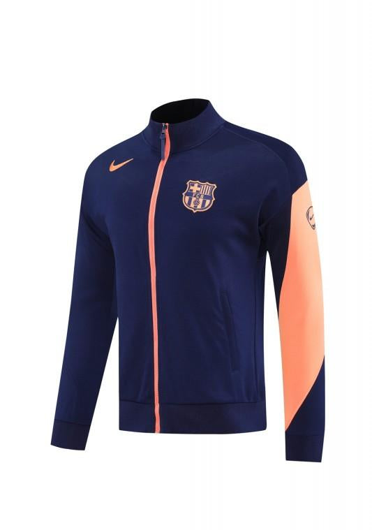 A jaqueta traz zíper frontal, gola alta e bolsos laterais. O escudo do Barça e o logo da Nike aparecem bordados em laranja, destacando-se sobre o tecido azul escuro. Nas mangas, o painel em tom laranja adiciona um toque moderno e ousado.
