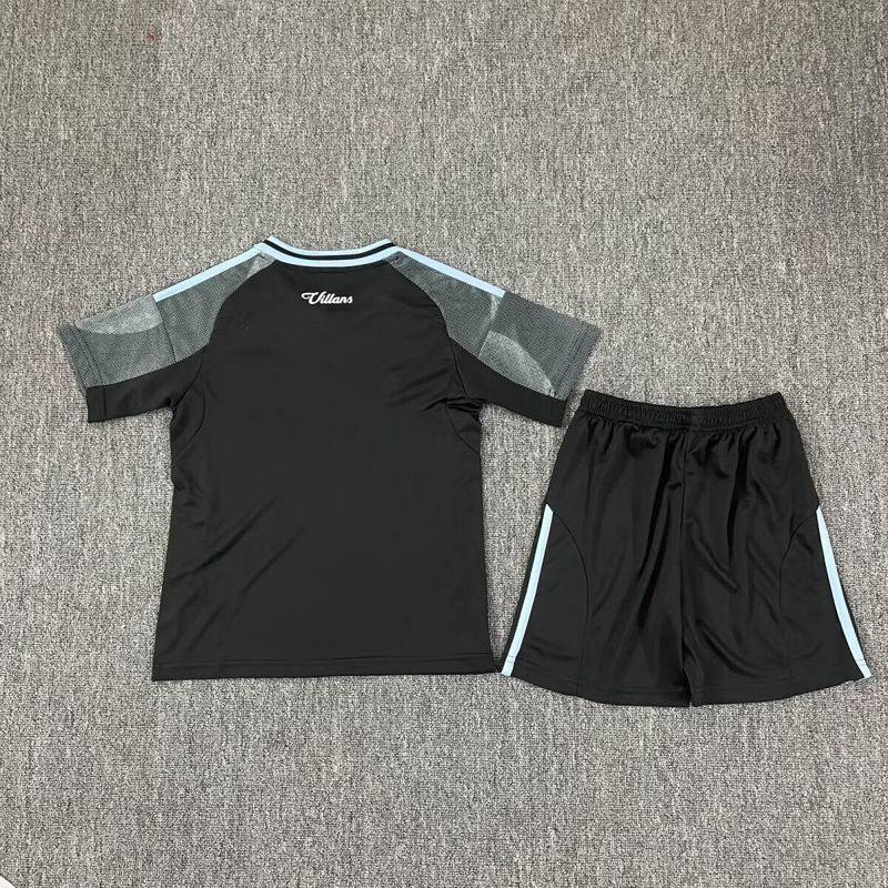 A camisa apresenta o preto como cor predominante, com mangas em tons de cinza que formam padrões geométricos, remetendo à fachada metálica do Bullring. A gola é redonda com acabamento em azul celeste nas laterais e nuca, mesma cor usada nas clássicas três listras da adidas posicionadas nos ombros. Na parte de trás da gola, aparece o apelido “Villans”, reforçando a identidade do clube.