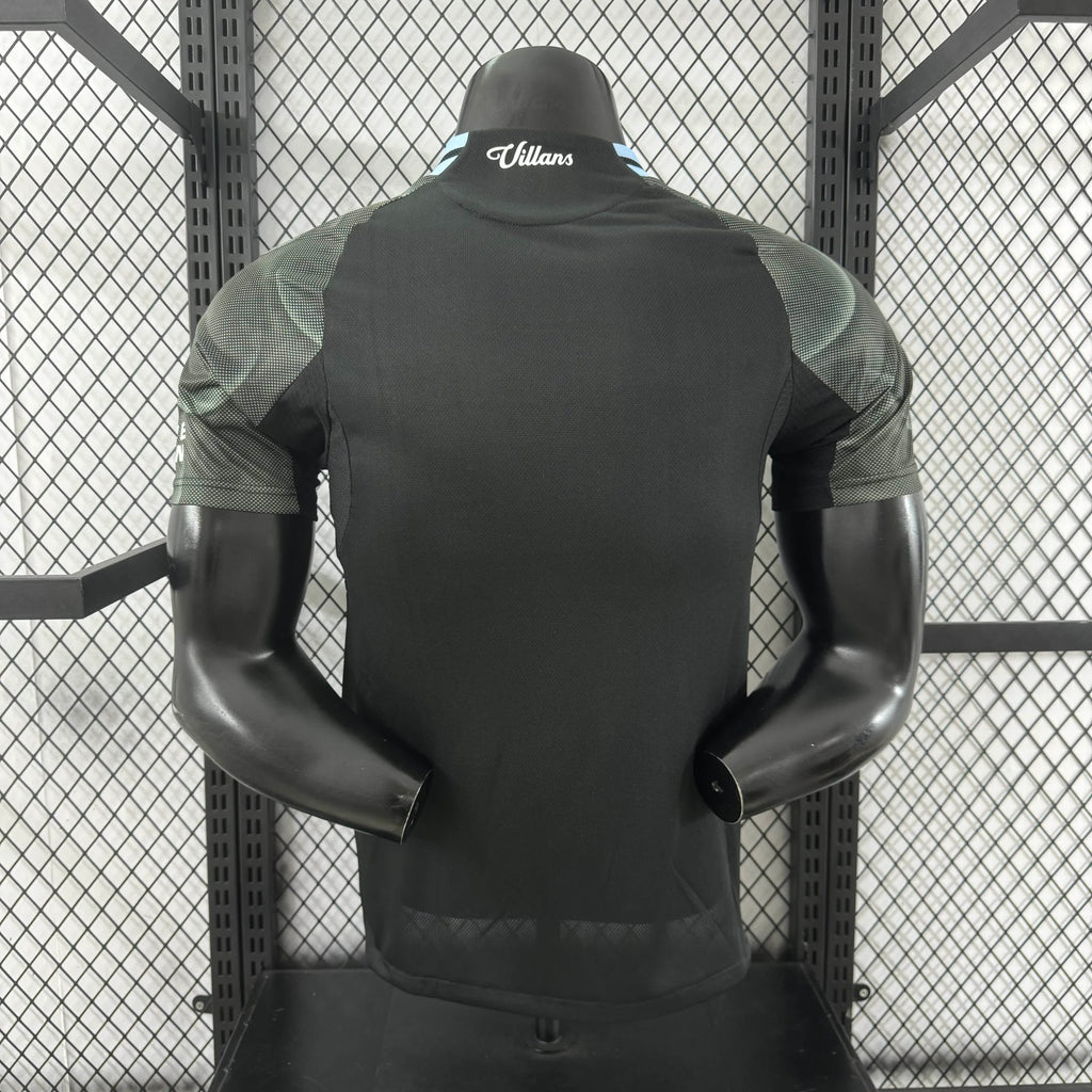 O escudo do clube vem em versão monocromática — branco, preto e azul-celeste — transmitindo sofisticação e força. Na parte traseira, logo abaixo da gola, está o apelido da equipe: "Villans".