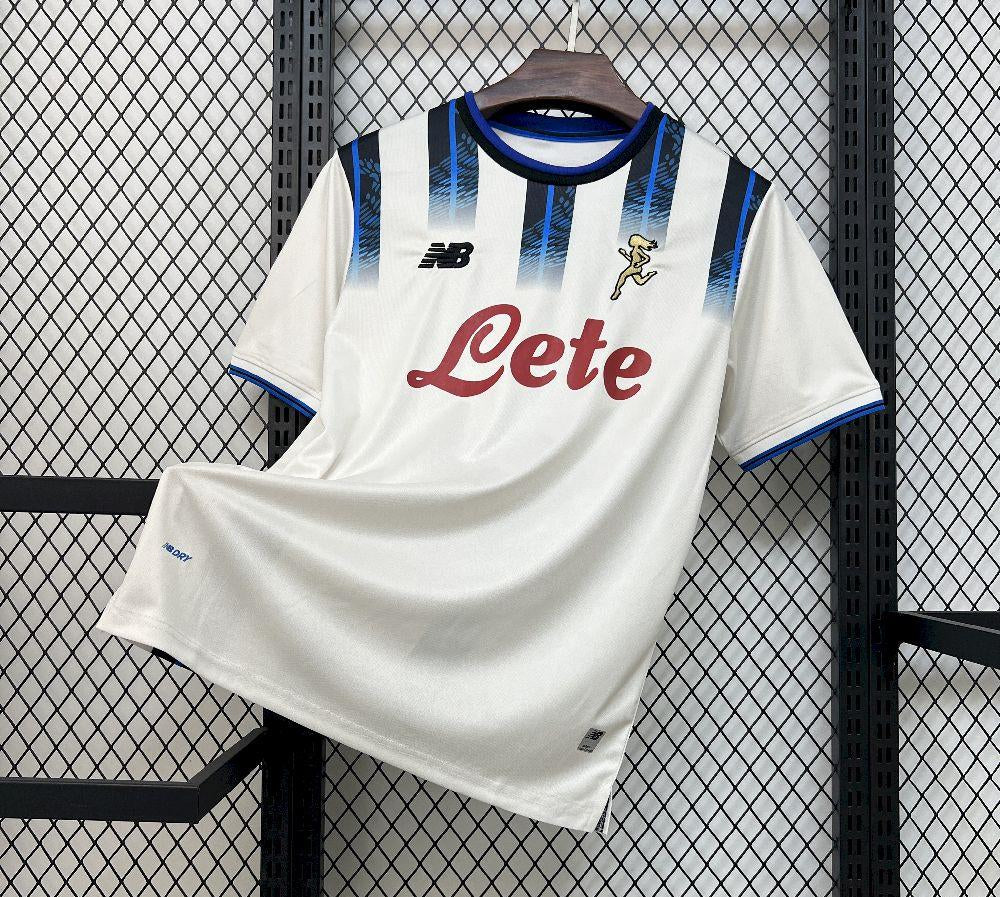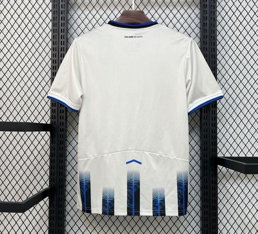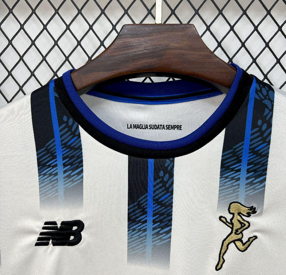 O escudo dourado da Deusa Atalanta em corrida, posicionado no peito, é inspirado no logotipo usado pelo clube desde 1963. A gola redonda em preto e azul completa o visual com sobriedade, enquanto no interior está gravada a frase “La Maglia Sudata Sempre”, lema que reflete o esforço e entrega da equipa dentro de campo.