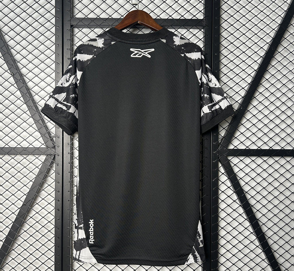 O logotipo da Reebok aparece em branco com contorno preto, tal como o patrocínio máster da VBet, mantendo a harmonia visual da camisola principal. Nas costas, um painel branco foi estrategicamente colocado para realçar a numeração e o nome dos jogadores em preto, garantindo visibilidade e estilo.