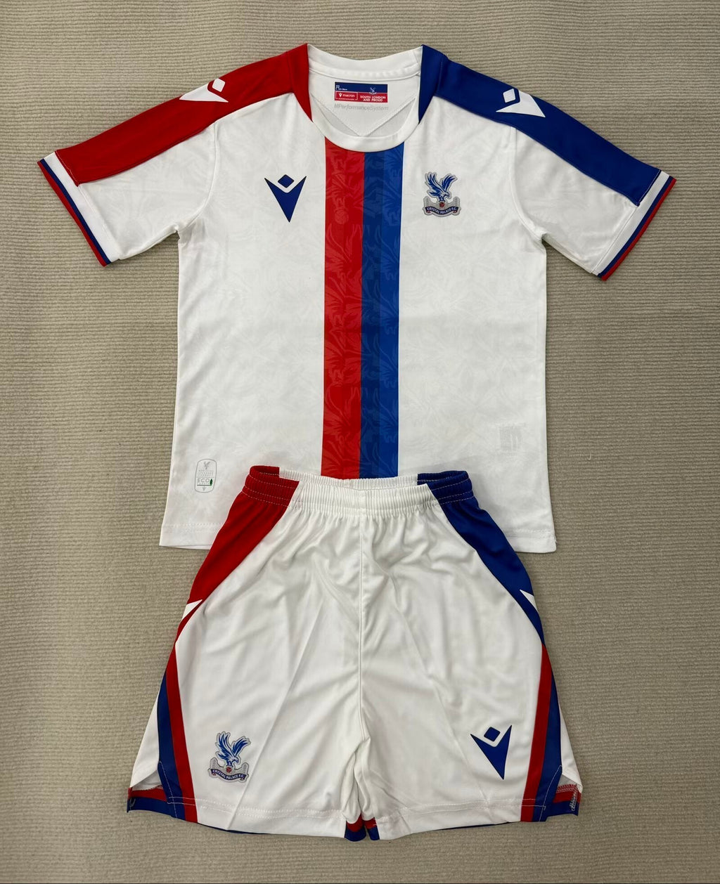 Os punhos contam com detalhes tricolores, reforçando a estética do clube. O escudo do Crystal Palace aparece bordado no lado esquerdo do peito, enquanto o logo da Macron está em azul no lado direito e em branco nas mangas. Na parte de trás da gola, a icônica águia do clube finaliza o visual com elegância.