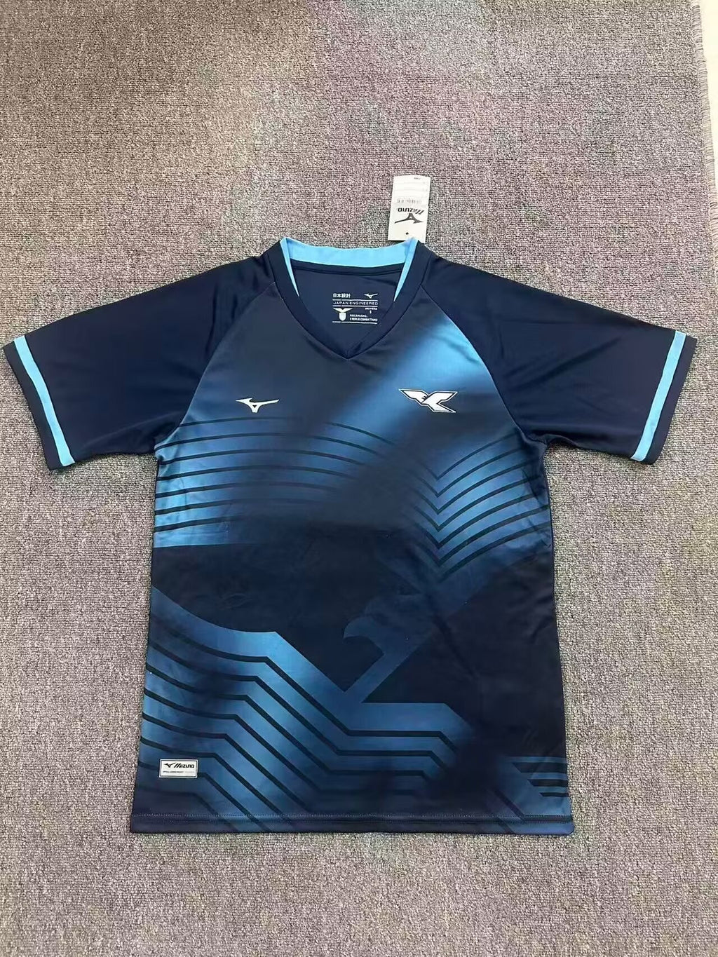 A gola em formato V traz acabamento em azul-marinho com bordas celestes, assim como os punhos, reforçando o contraste elegante. O logo da Mizuno aparece em branco, no lado direito do peito e nas mangas.