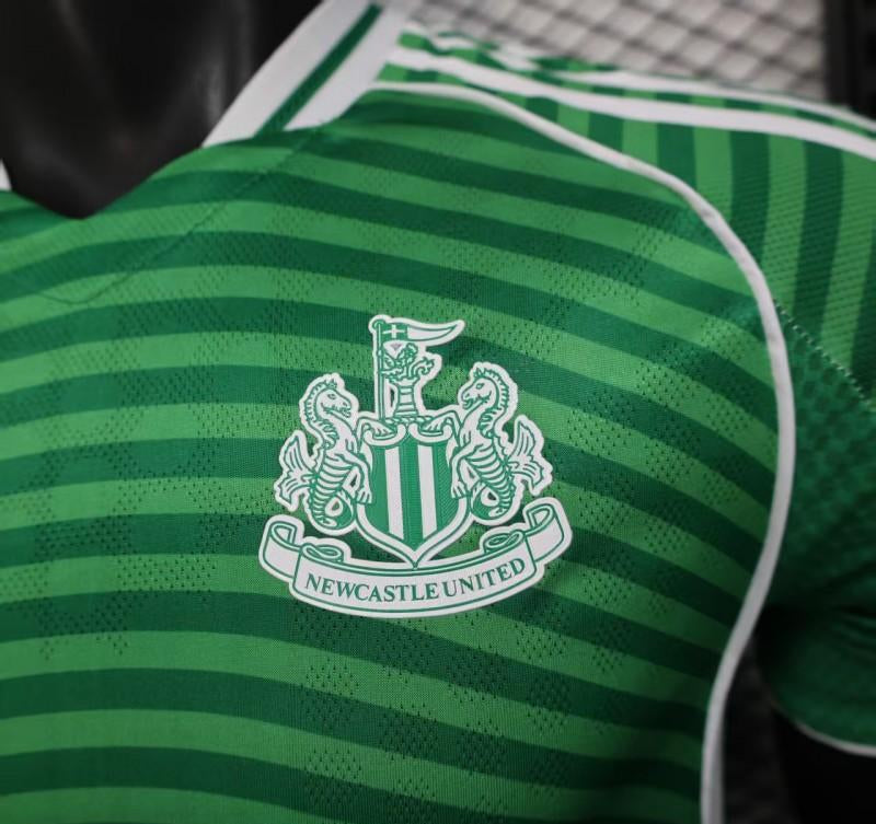 Inspirada na ponte Tyne, marco emblemático da cidade de Newcastle, a camisola apresenta um design gráfico circular em verde vibrante com detalhes em branco, representando a união entre o clube e sua comunidade.