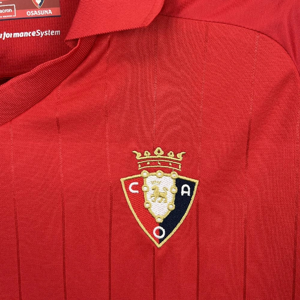 O escudo do clube está bordado com acabamento premium no peito esquerdo, ao lado do logótipo da Macron. Na parte traseira, um detalhe especial celebra a trajetória europeia do Osasuna: a inscrição de todas as partidas disputadas em competições continentais.