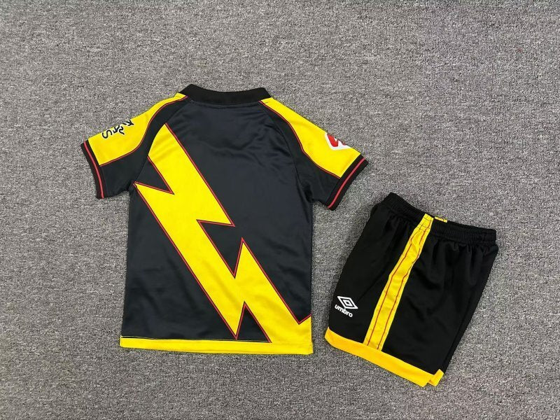 O Conjunto Infantil Rayo Vallecano III 25/26 apresenta a terceira opção de uniforme do clube para a nova temporada, agora em versão pensada para os pequenos fãs. A camisola vem com base preta e destaque total para o raio em amarelo vibrante (dourado), com bordas em vermelho, criando um visual impactante e cheio de energia.