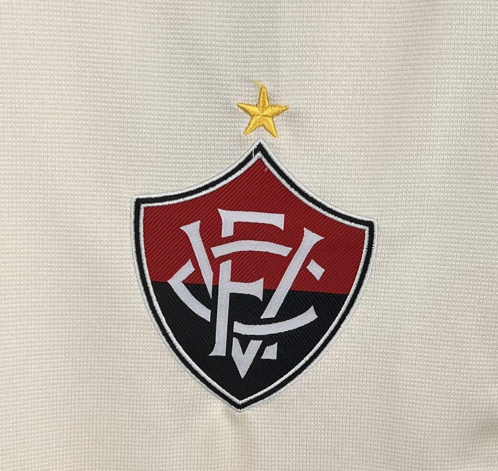 O escudo do Vitória FC está em destaque no peito esquerdo, bordado com alta definição, junto à tradicional estrela dourada acima, marcando as conquistas históricas do clube ✅ O logo da Volt aparece no lado direito, em equilíbrio visual ✅