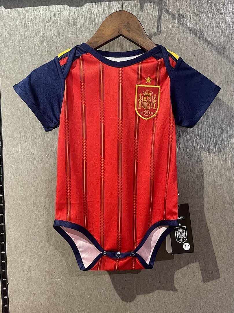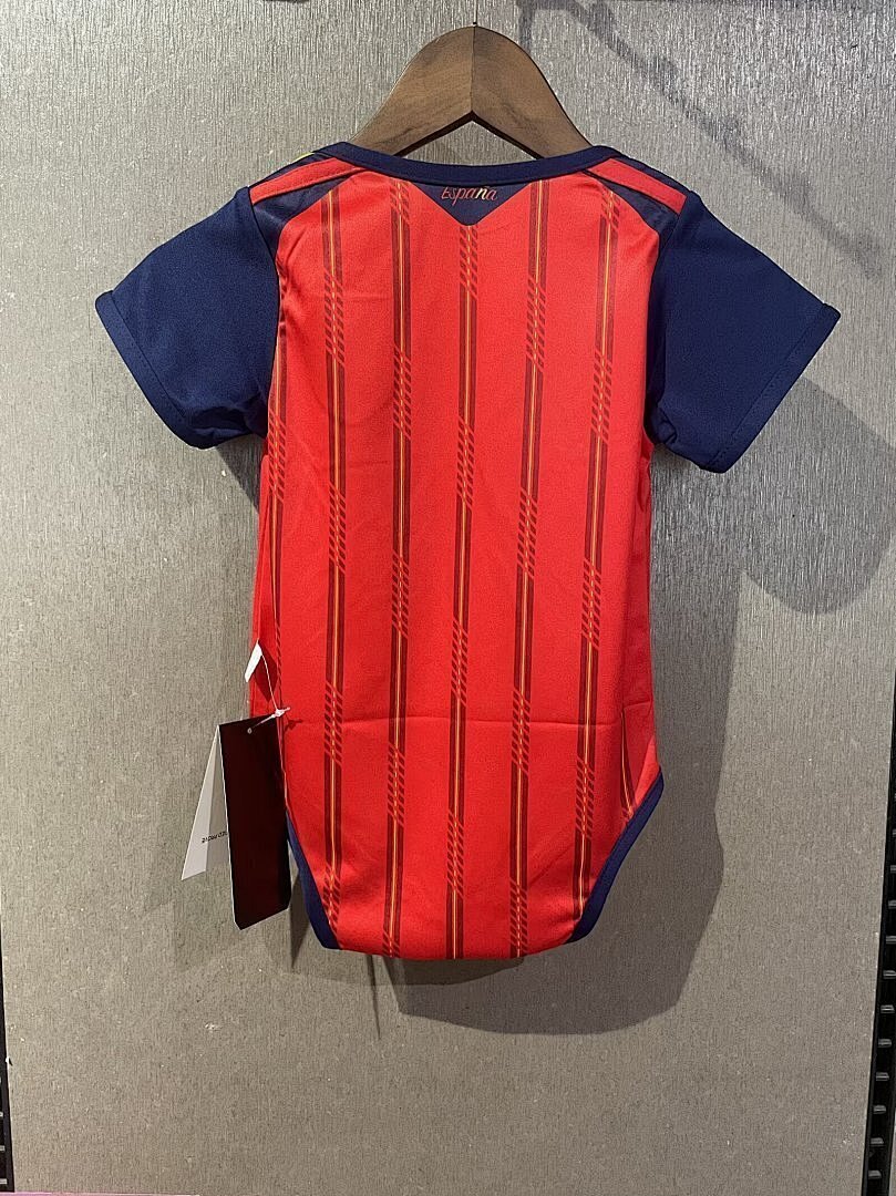 Este body é inspirado na camisola principal da Espanha 26/27, que será usada na Copa do Mundo de 2026, trazendo o tradicional vermelho como cor base, com listras verticais sutis em amarelo. Esses elementos representam a força, a paixão e a história que a seleção espanhola carrega em campo.