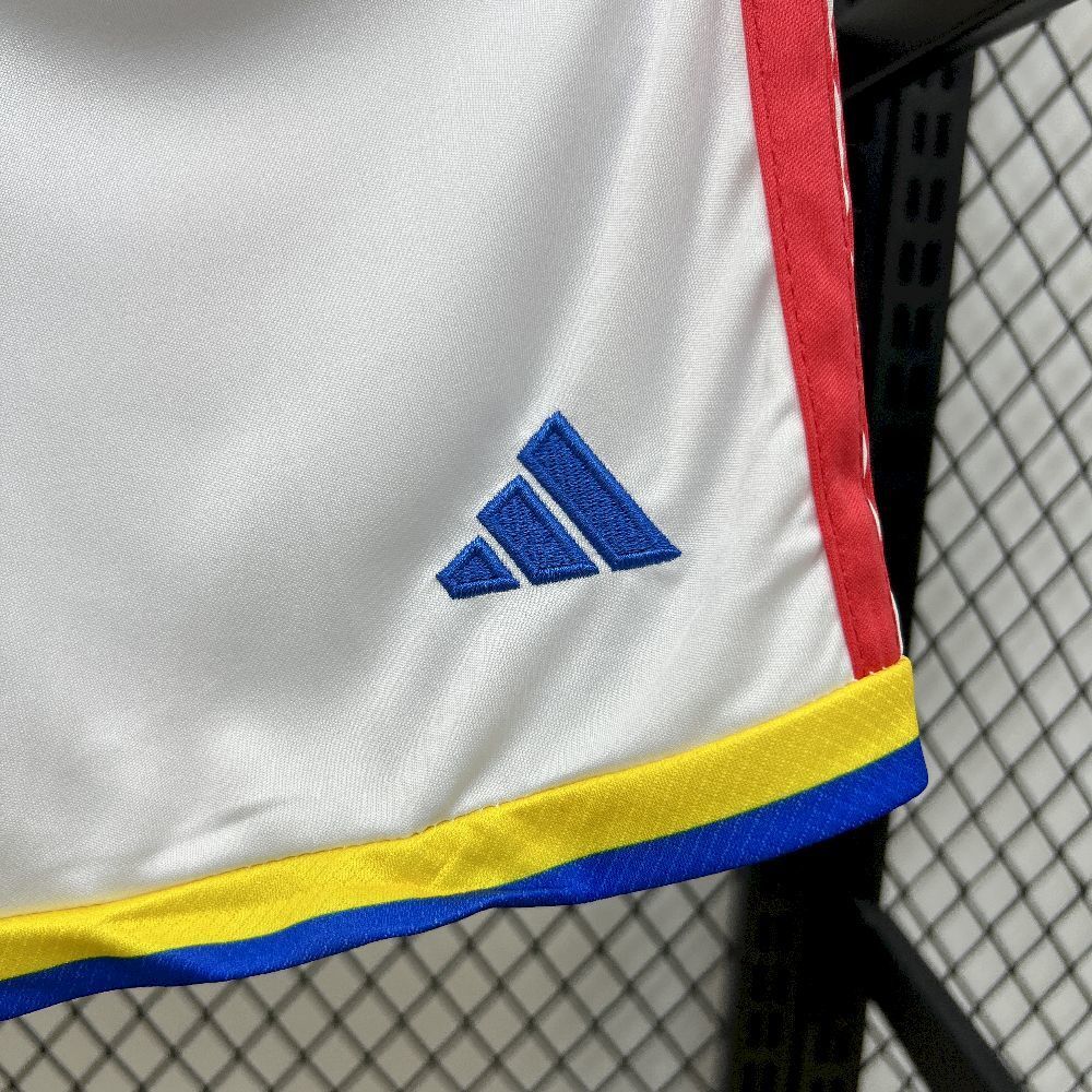 A camisola infantil Colômbia 26/27 mantém a tradição do amarelo vivo, com um grafismo em forma de borboletas, inspirado nas obras literárias de Gabriel García Márquez – uma homenagem à cultura e identidade do país. A gola em V apresenta acabamento azul, combinando com os punhos e contrastando com as três riscas vermelhas nos ombros.