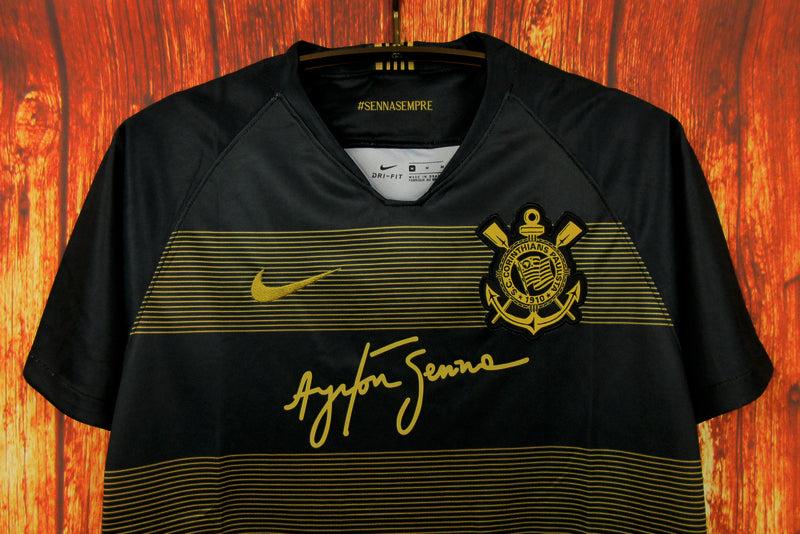 A Camisola Corinthians Ayrton Senna é uma edição especial que presta homenagem a um dos maiores ídolos brasileiros. Com design marcante em preto com detalhes dourados, esta camisola simboliza a velocidade, garra e paixão de Senna pelo Timão.