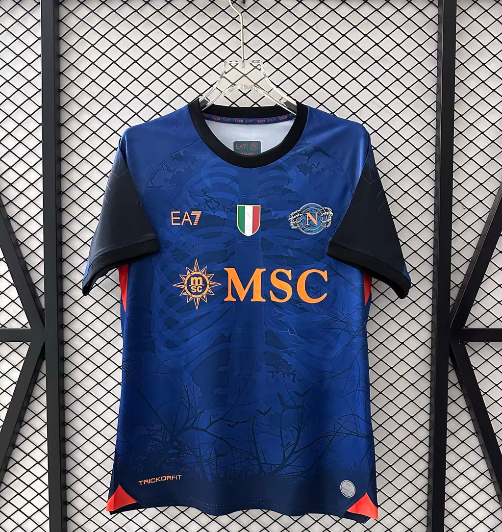 O escudo do Napoli aparece no peito esquerdo em versão vazada, segurado por mãos esqueléticas que brilham no escuro – um detalhe exclusivo e marcante. Os logótipos da EA7, MSC e restantes patrocinadores estão estampados em laranja, tal como o nome "SSC Napoli" na nuca, garantindo contraste e identidade visual forte.