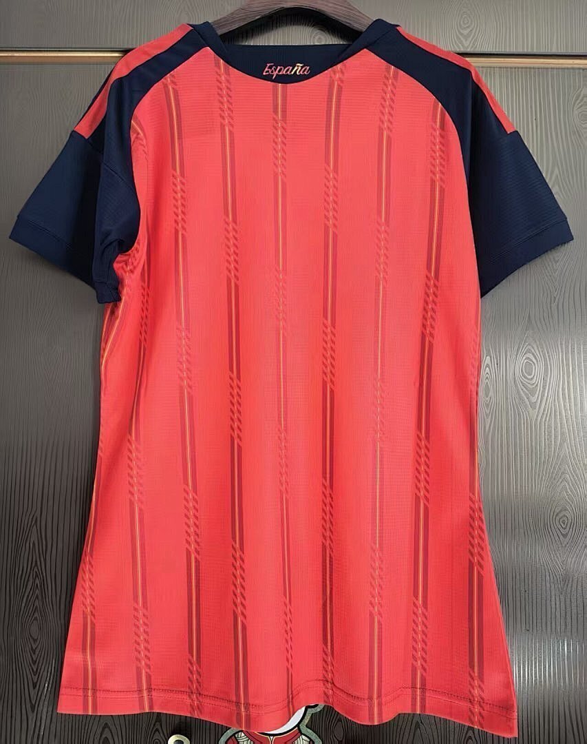 O modelo apresenta base em vermelho vibrante, com finas listras verticais em amarelo, remetendo diretamente às cores da bandeira da Espanha. A gola redonda e as mangas em azul-marinho criam um contraste sofisticado e moderno. Nos ombros, três faixas alternadas em vermelho e amarelo reforçam a energia e o orgulho do país.