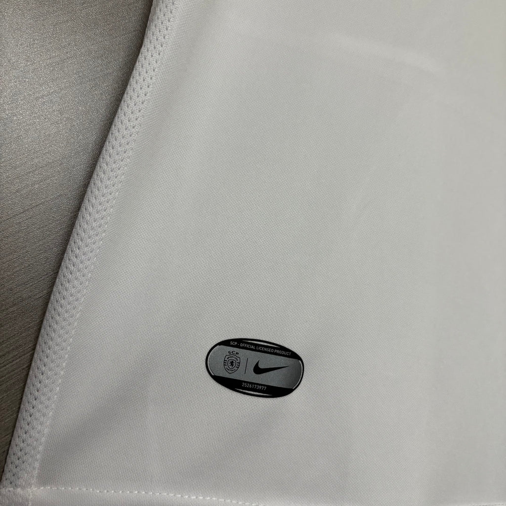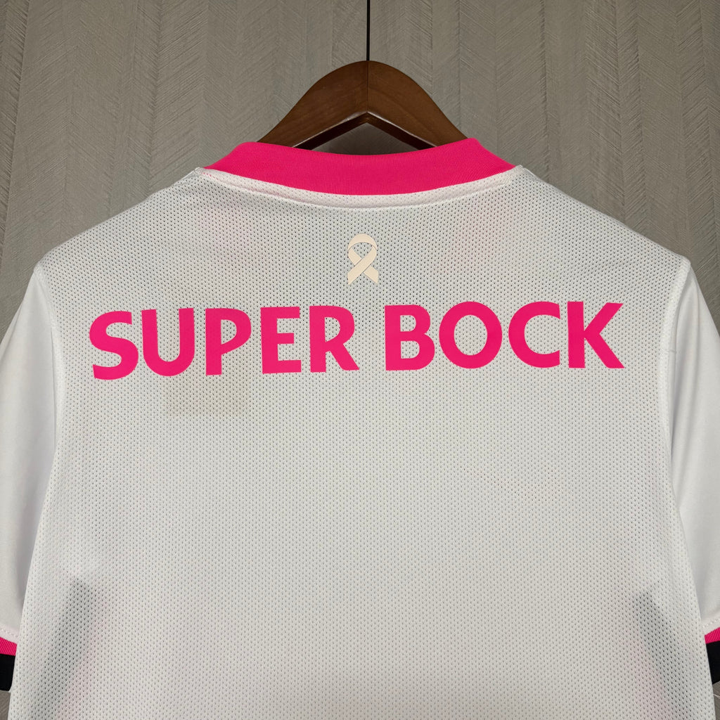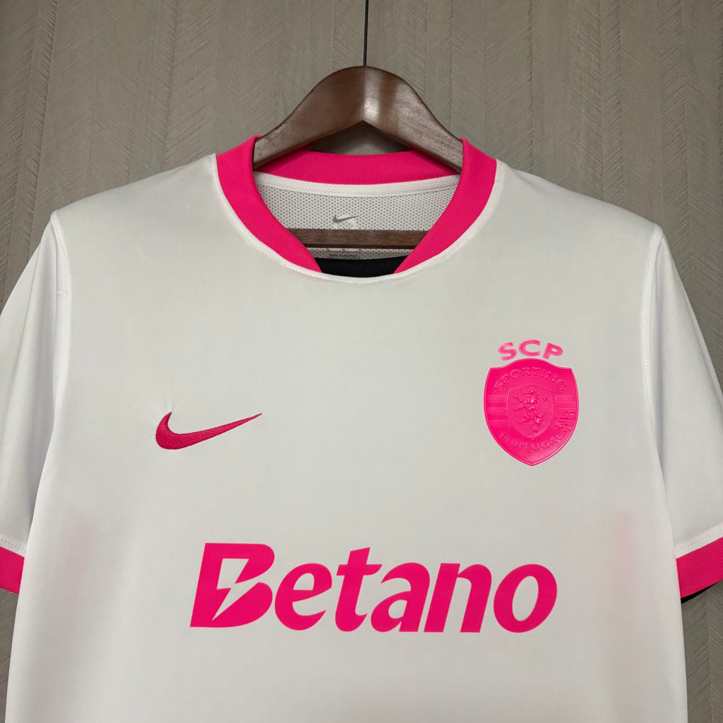 O visual da camisola é limpo e moderno, com base branca e detalhes em rosa vibrante nos punhos, gola e logótipos, incluindo o escudo do Sporting CP em versão monocromática rosa, o Swoosh da Nike e o patrocínio da Betano. Na parte de trás, o logo da Super Bock mantém a identidade visual em rosa e, logo acima, o icônico laço símbolo da campanha Outubro Rosa é aplicado com destaque — uma homenagem visual poderosa à causa.