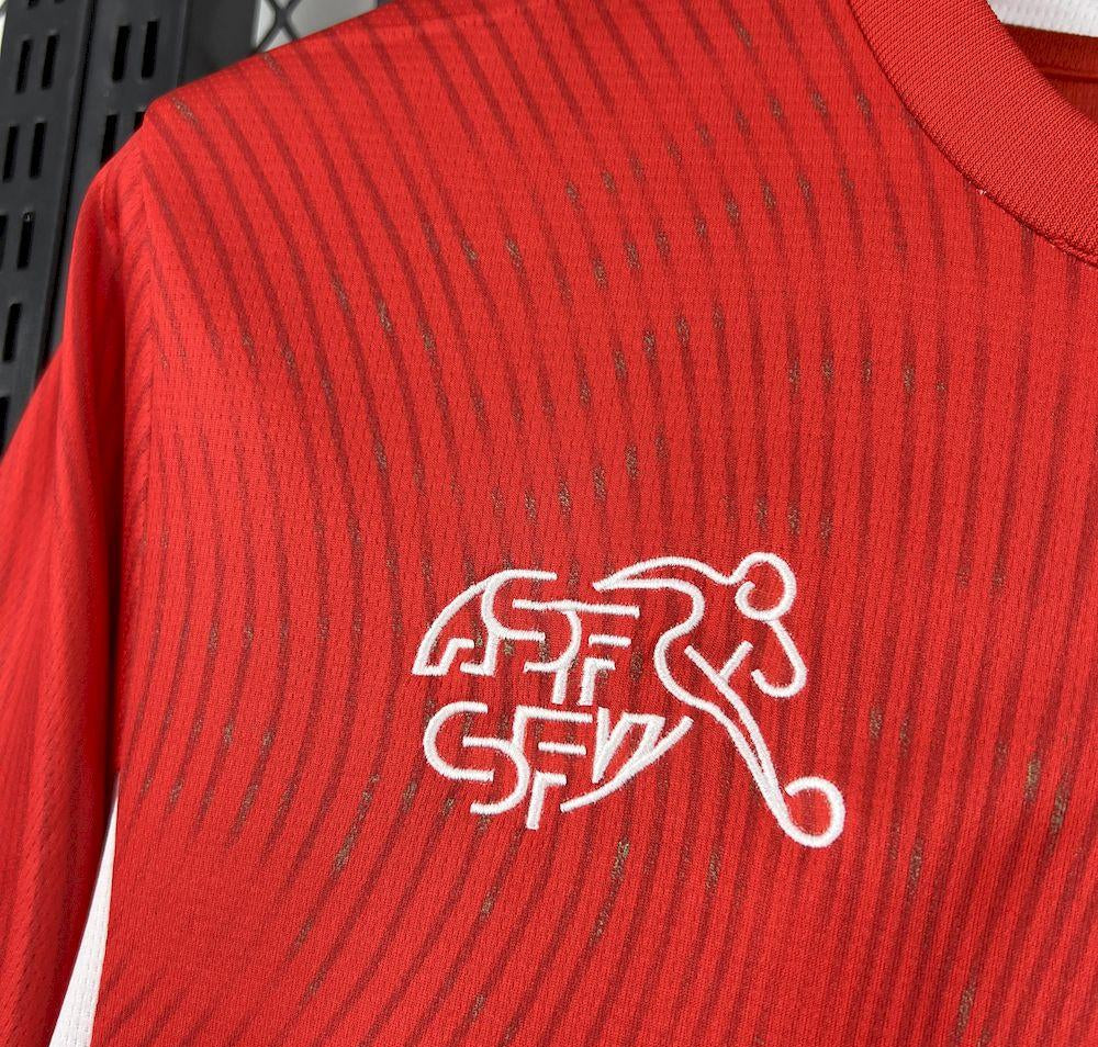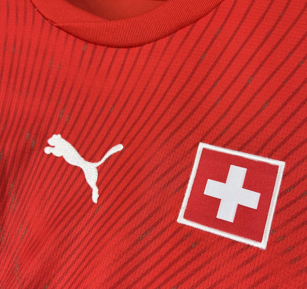 A camisola principal da Suíça 2026/2027 mantém a tradição do vermelho dominante, agora com um grafismo moderno em todo o corpo da camisola que remete à topografia dos Alpes Suíços – símbolo nacional do país. Um detalhe discreto e elegante que valoriza ainda mais o visual do uniforme.
