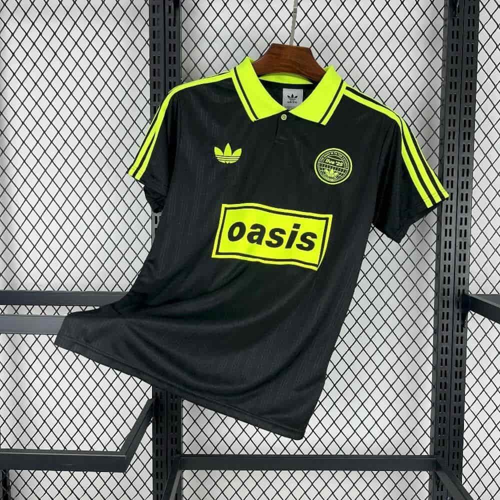 A t-shirt chega em preto profundo com listras verticais em tecido texturizado e recebe detalhes em amarelo neon, incluindo o logo Trefoil da Adidas, as três listras nos ombros e o emblemático patrocínio “Oasis” centralizado no peito. A gola polo e os acabamentos vibrantes dão ainda mais personalidade à peça.